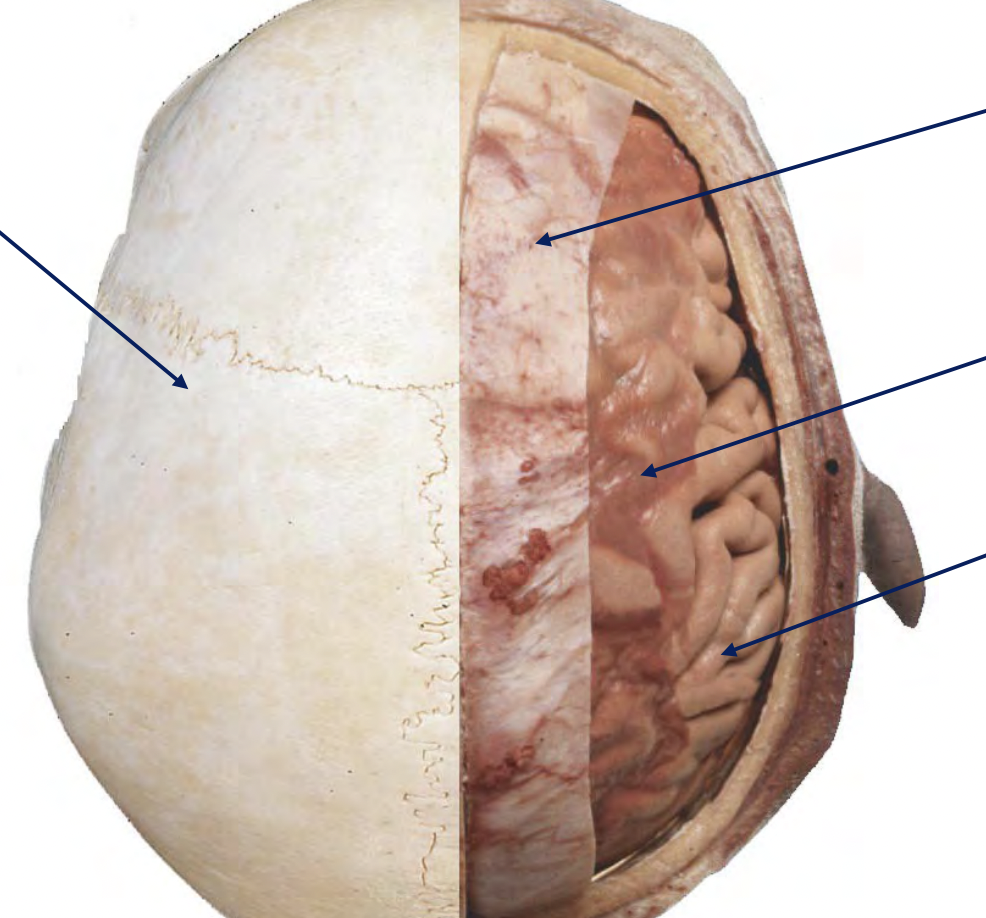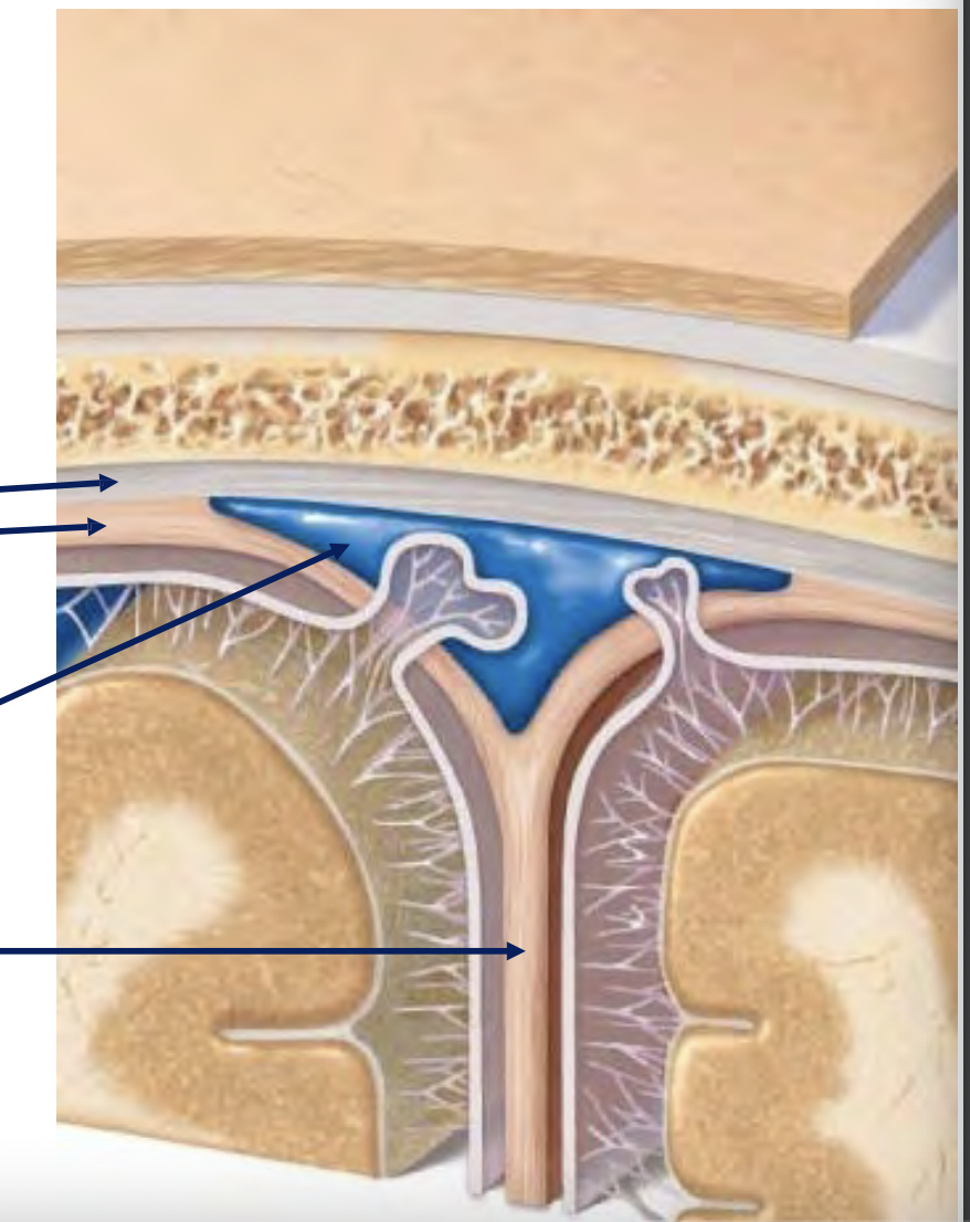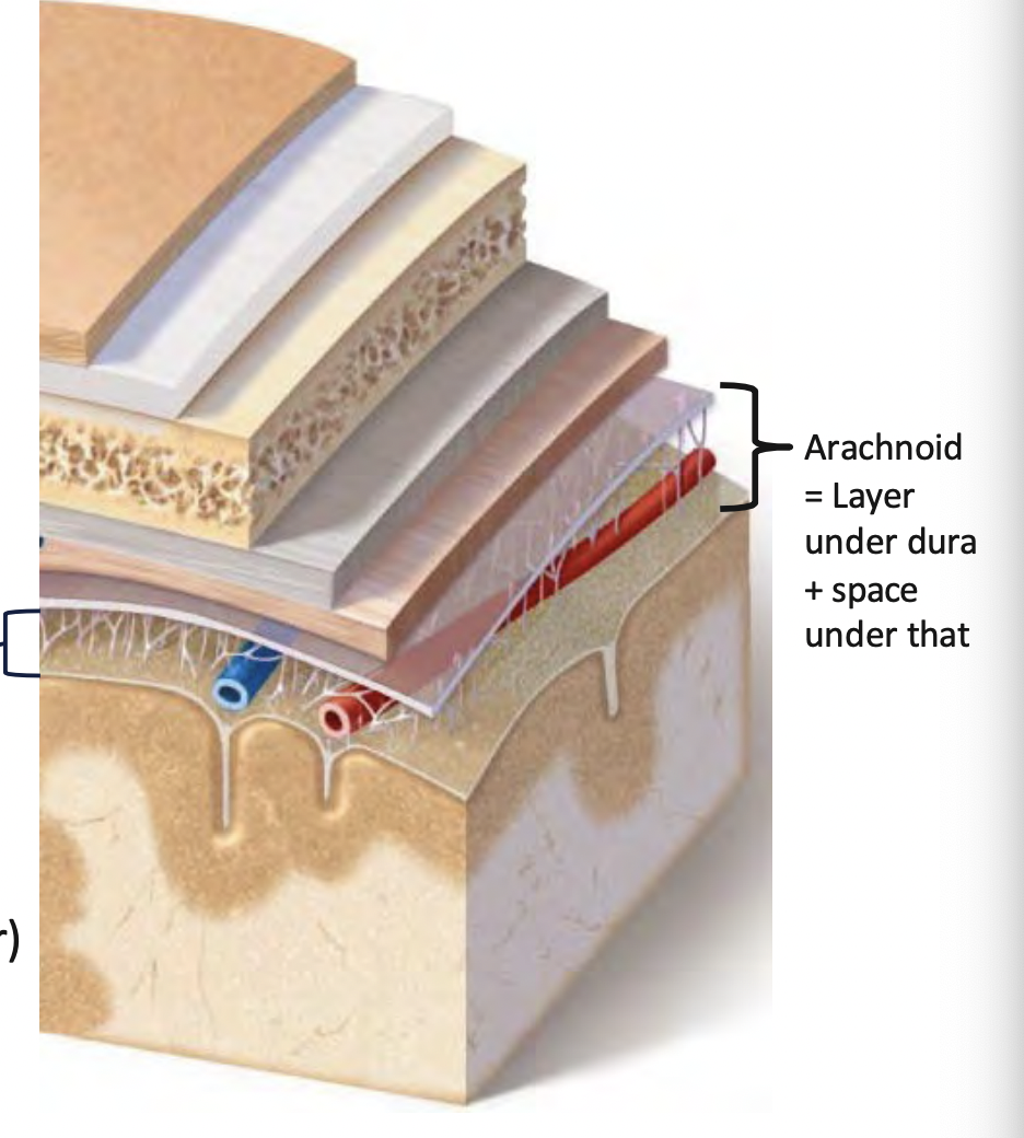 -Adheres to brain and follows gyri (hills) and extends into sulci (furrows)