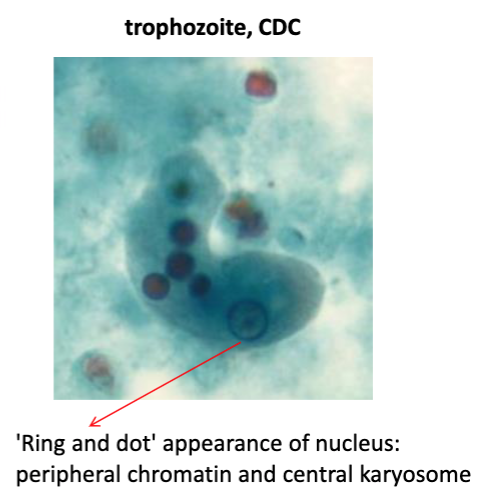 True or False: In the trophozoite form of E. histolytica, the nucleus has a “ring and dot” appearance (peripheral chromatin + karysome)