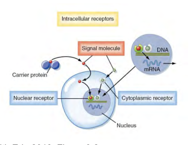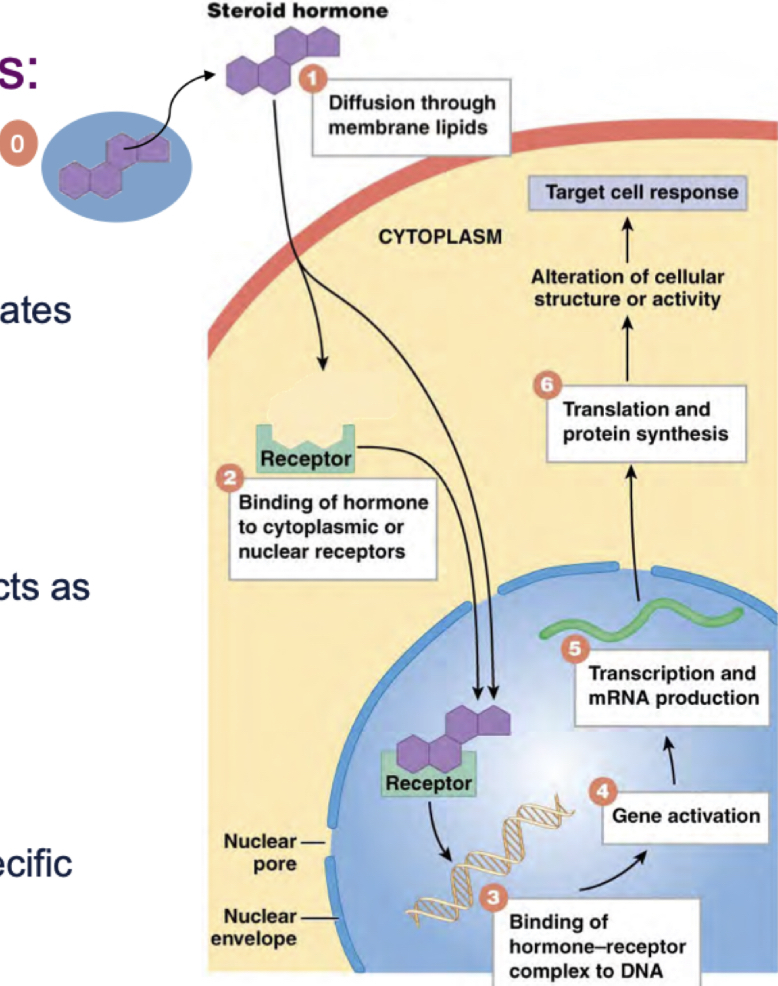 Able to diffuse cell membrane into target cell, so receptors are located in cytoplasm or nucleus