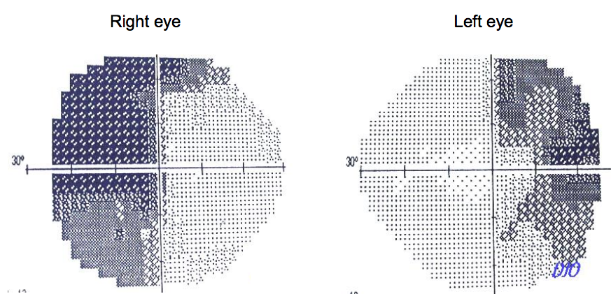 Based on the visual pathway of light, and based on the ‘golden eye rules’, he has some sort of lesion impacting the optic chiasm where the detectors of this visual field (nasal retinal fibres) cross over.