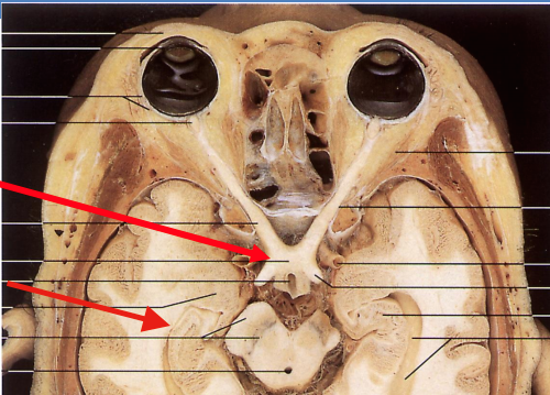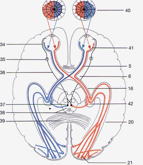 The optic nerves from the back of the globes relay towards the optic chiasm, which is situated in the midline (in between the internal carotid arteries) at the base of the brain, anterior to the pituitary gland. From there they fan out again, moving posteriolaterally to the LGN of the thalamus.