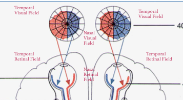The temporal visual field projects onto the nasal retinal field because of the shape of the globe and the way in which the light enters the eye. Thus the nasal visual field projects/is sensed by the temporal retinal fibres.