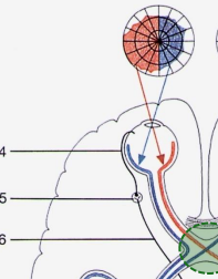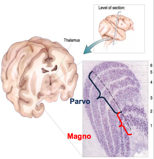 The LGN is organised into six layers, each receiving information only from one eye per layer and one type of cell (M cell or P cell) per layer.