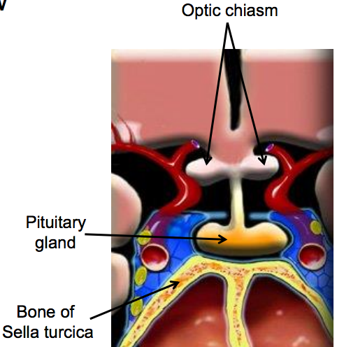 Describe the relationship between the pituitary gland and the optic chiasm in terms of pathology