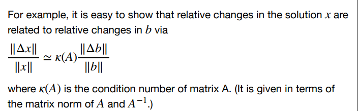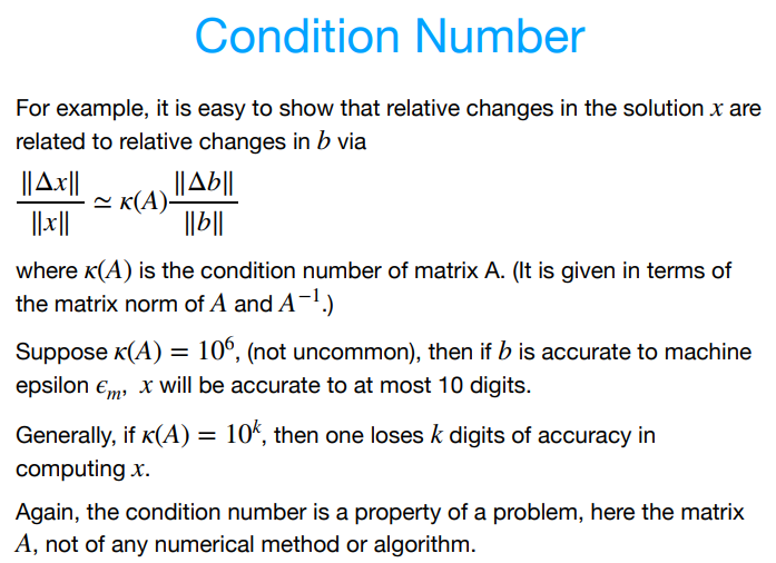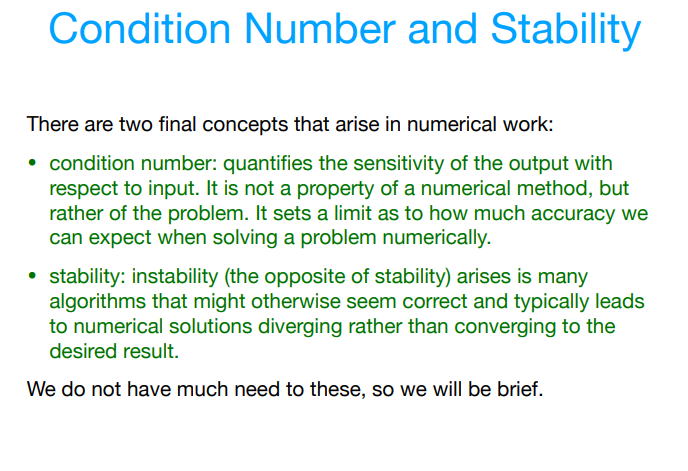 What are the concepts “condition number” and “stability” that arise in numerical work?