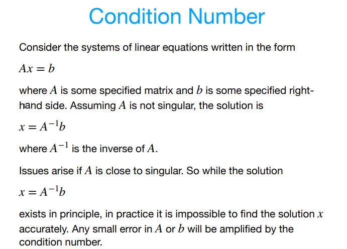 How do we run into a “condition number” problem when solving a system of linear equations Ax=b when A is invertible but very close to being singular but is not?