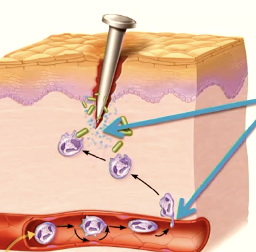 -Neutrophils squeeze through leaky capillary wall, following chemical trail to injury site
