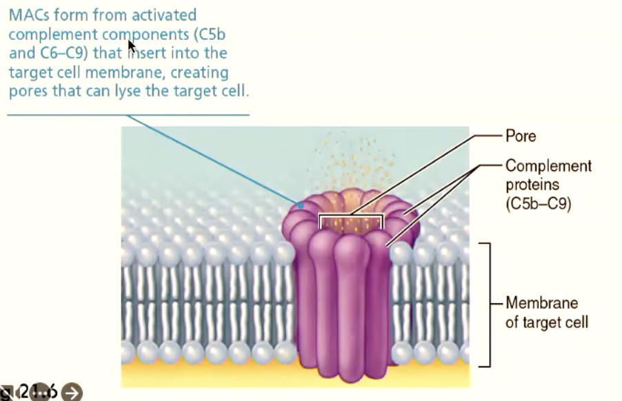 C9 forms Membrane Attack Complex (MAC) pokes holes in bacterial cells and kill them