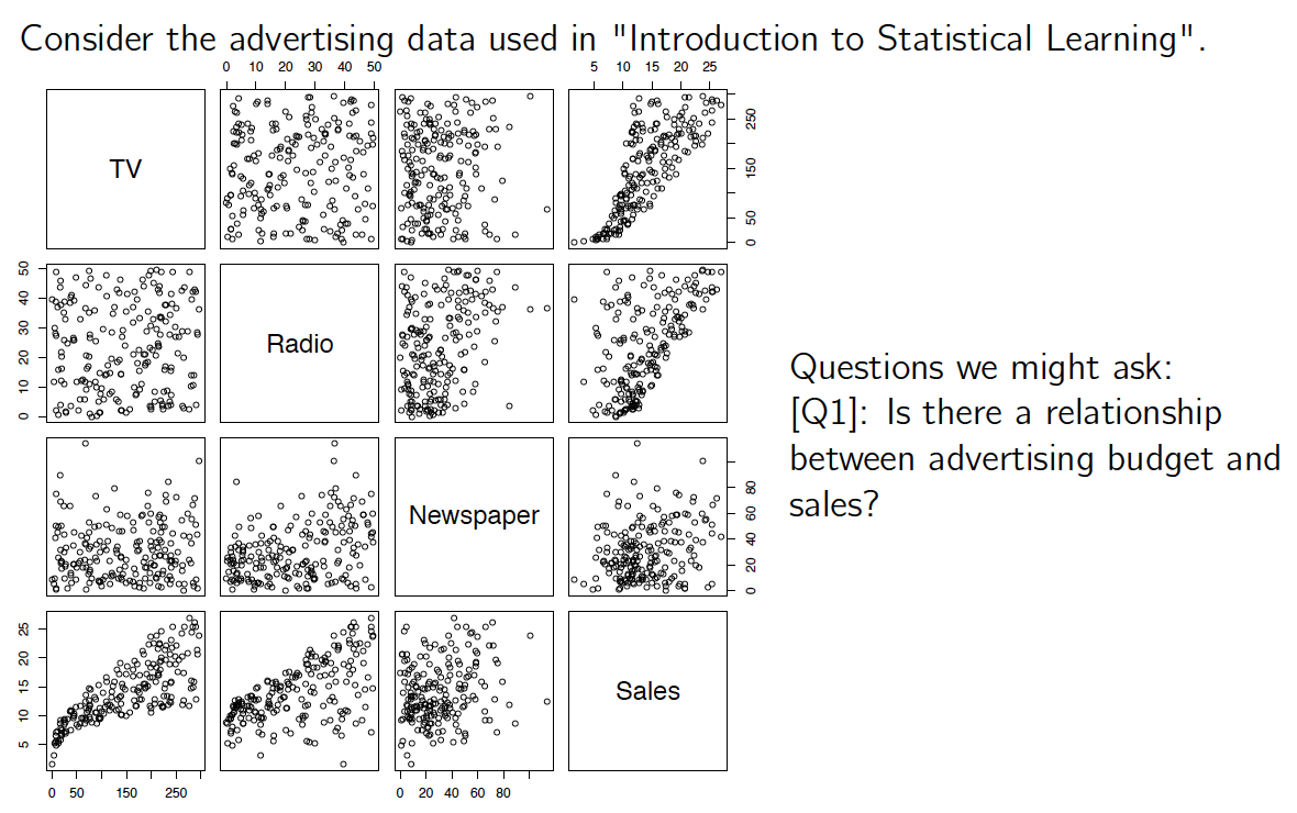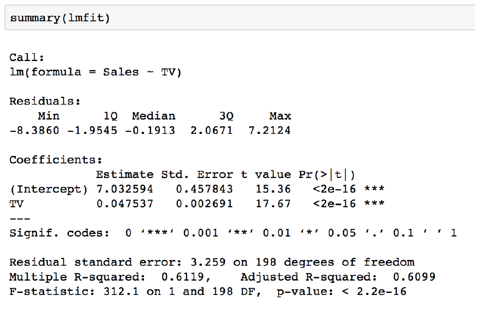 In this case, the intercept and TV variable appear to be significantly related to sales.