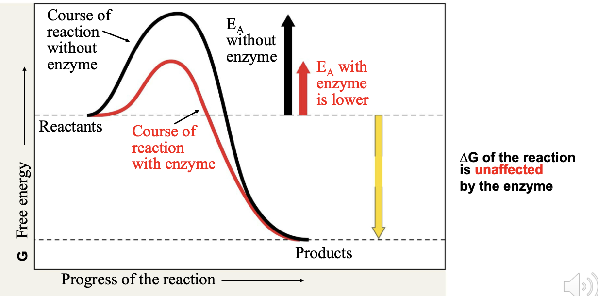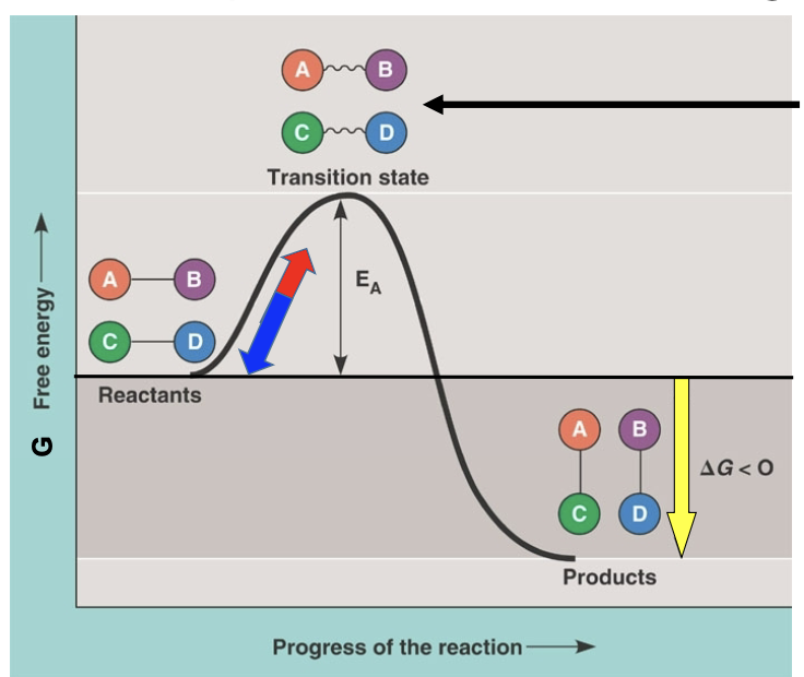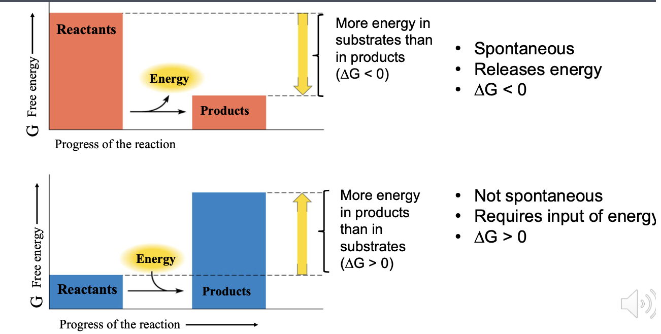 negative delta G = spontanrous, requires no energy input (Active transport) - more energy in substrates than in products