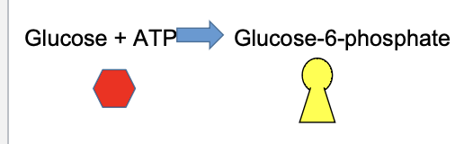 Glucose and ATP (reactants, shown as red hexagon) binds to hexose kinase at