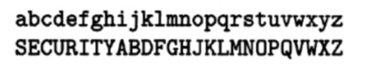 A simple substitution cipher. Each latter is mapped to another one.