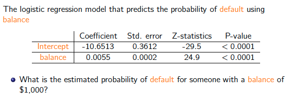 Using the logistic regression formula, what is the estimated probability of default for a person with balance of $1000?