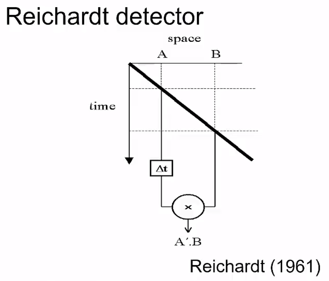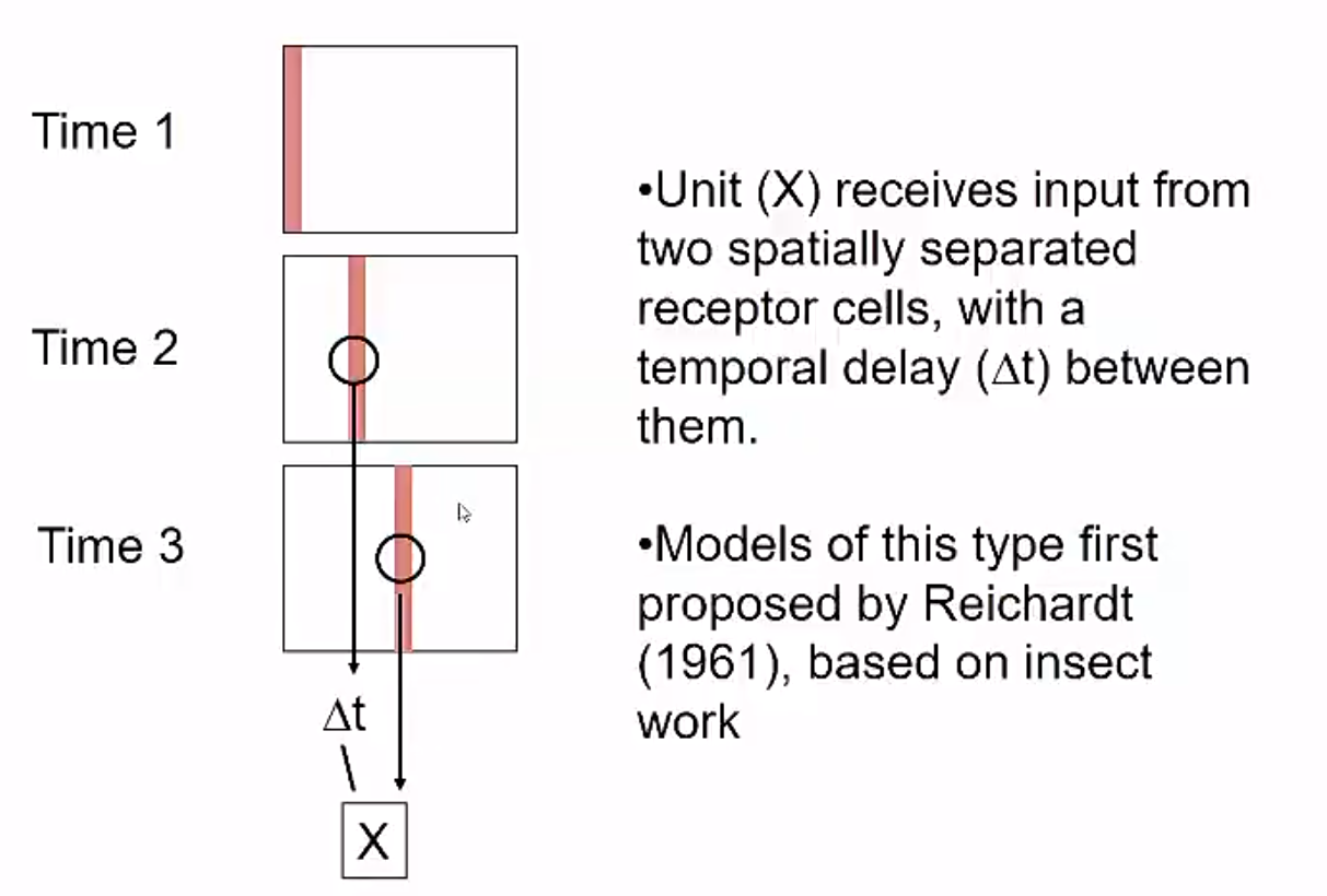 It has two input signals, one of which is delayed. If a stimulus is moving in one direction the delayed receptor and the normal receptor will reach each other at the same time, indicating movement in a certain direction.