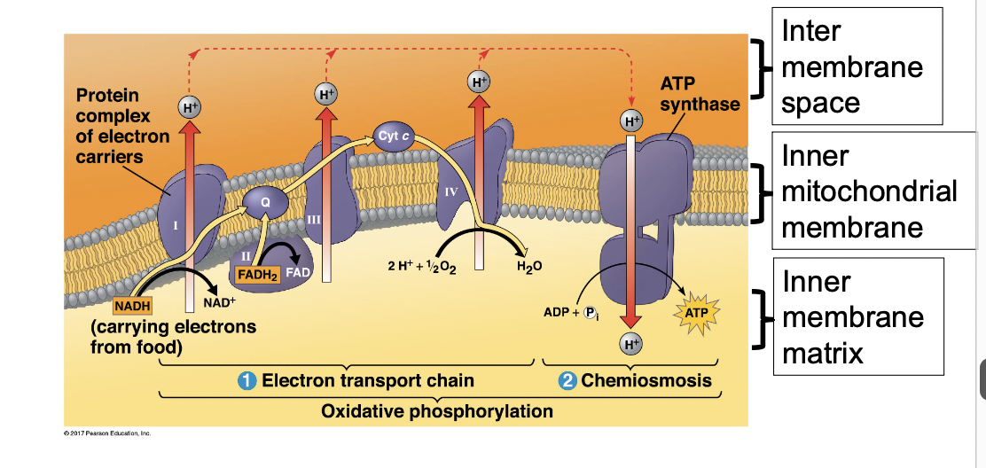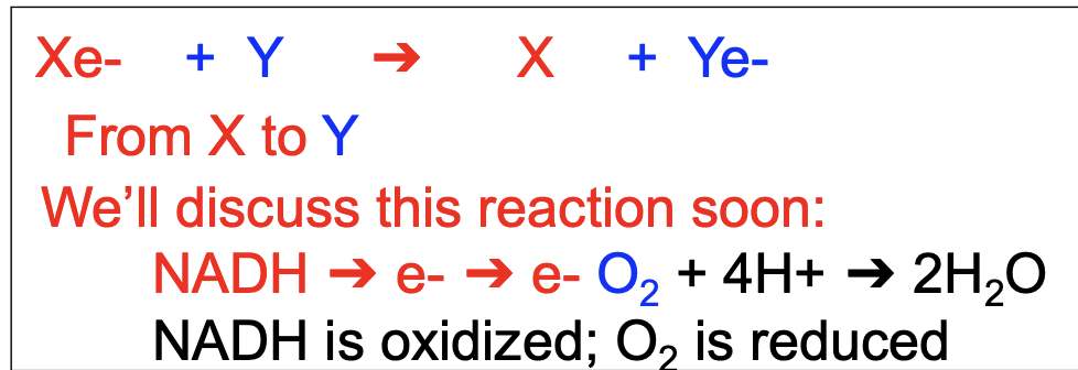 As NADH is oxidized, released e- are transported sequentially down a chainn of proteins - electron transport/respiratory chain