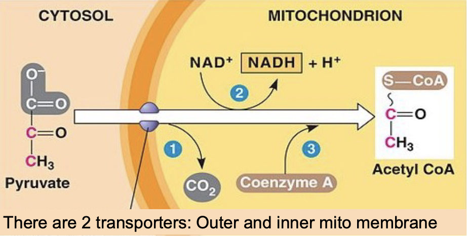 oxidzes pyruvate (INPUT) to 2 acetyl-CoA + 2 CO2 + 2NADH (OUTPUT)