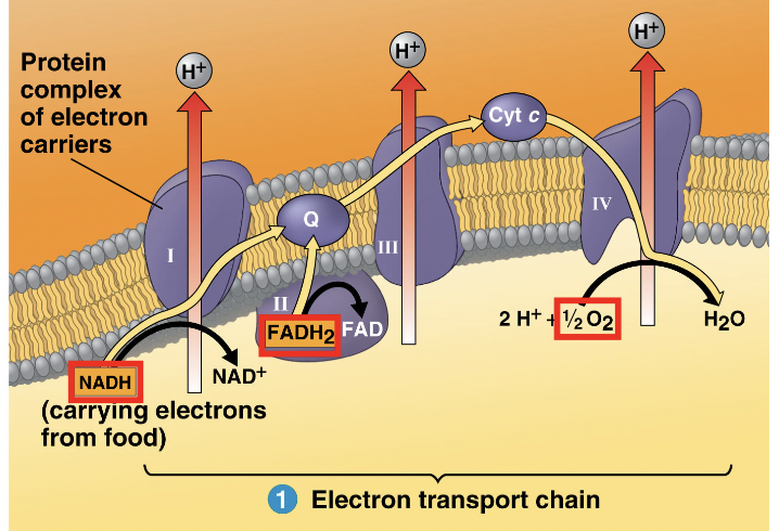 4 diff protein complexes accept e - from NADH, FADH2 and transports them to other proteins to acceptors w/ increasing electronegativity