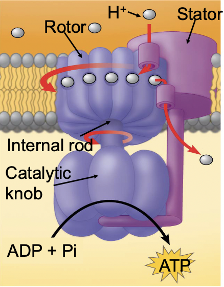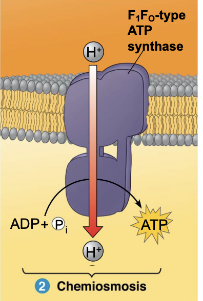 protons flow down the gradient (Phase 2 chemiosmosis) through active proton pump (F1F0 ATP synthase) that can work in reverse to generate ATP from the proton gradient (4H+ make 1 ATP)
