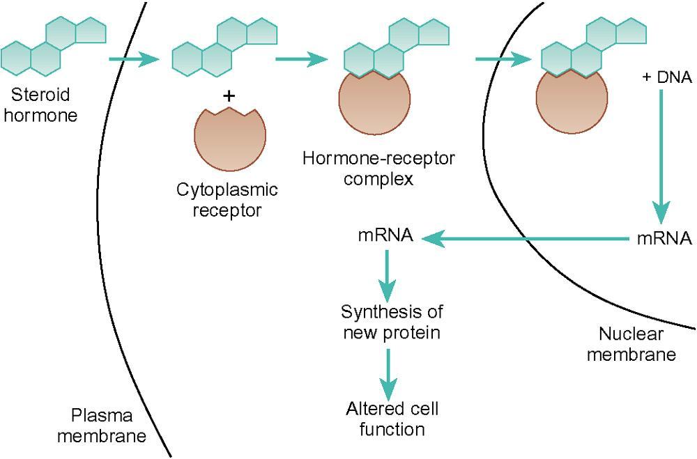 Steroid hormones pass through the plasma membrane and bind to intracellular receptors to regulate gene transcription. - obrazek