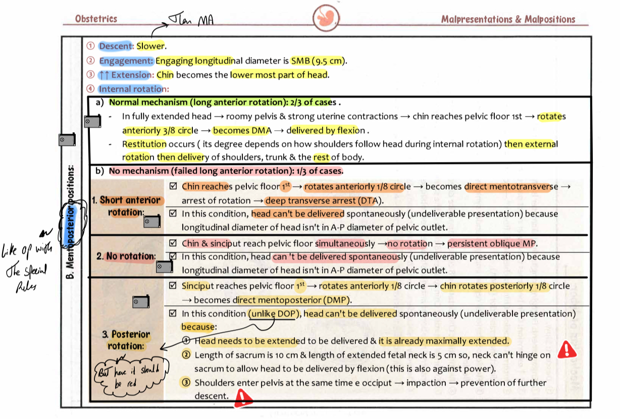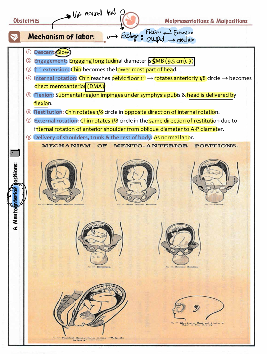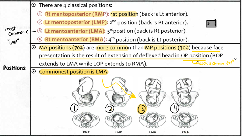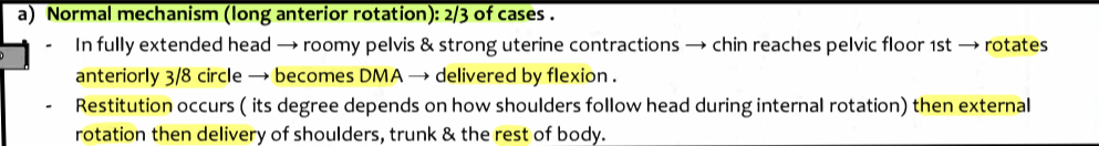 Chin rotates 1/8 circle in the same direction of restitution due to internal rotation of anterior shoulder from oblique diameter to A-P diameter.
