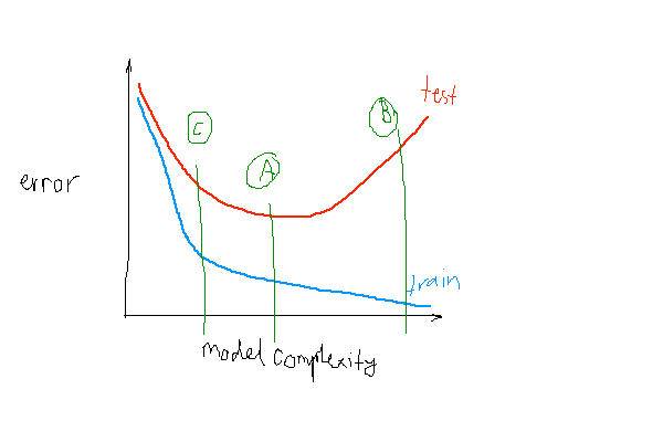 Where is the best model complexity, ABC, based on the train and testing error? Why?