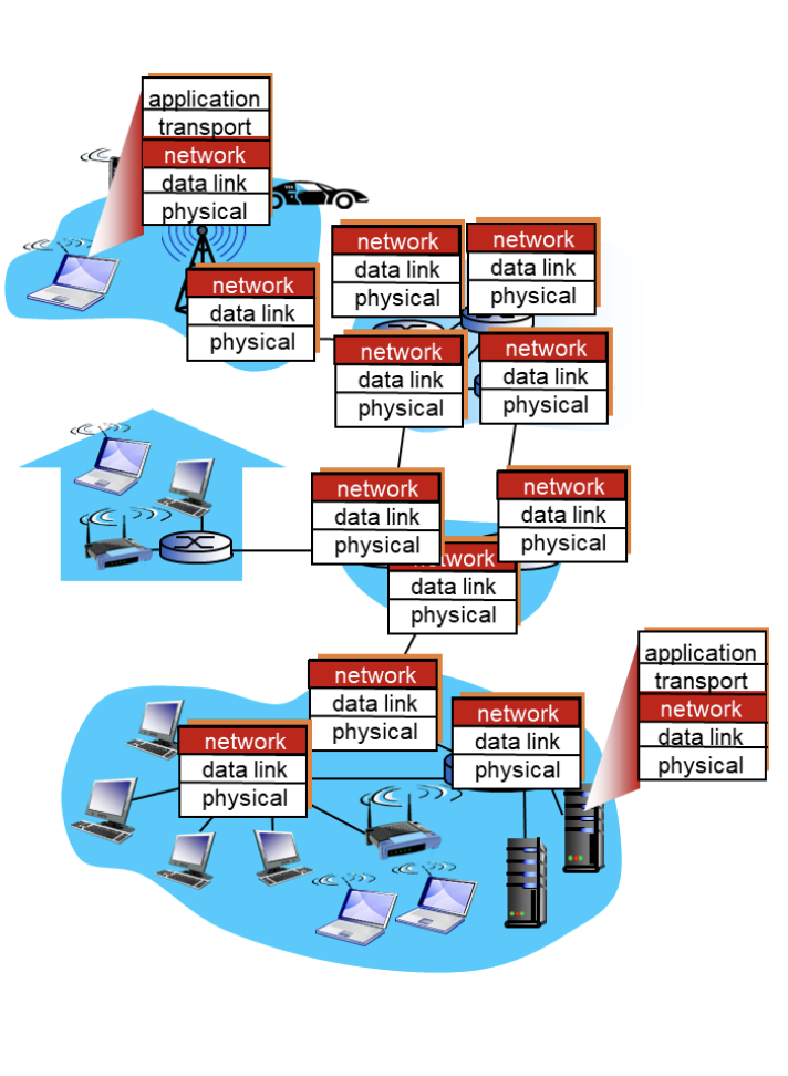 The layered architecture (Application, Transport, Network, Data Link, Physical) across different devices and network components.