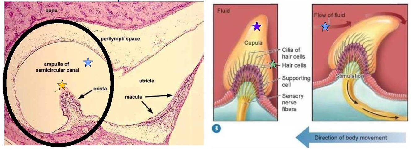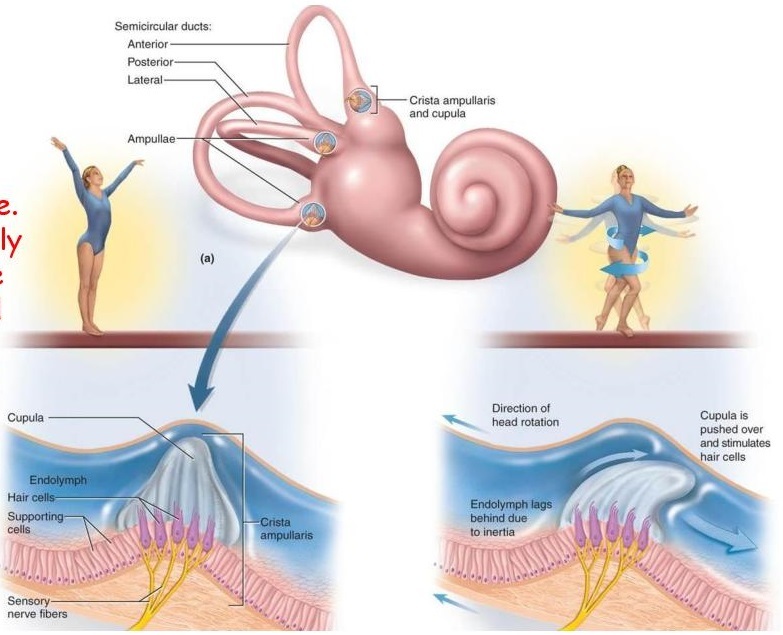 Cupula has same specific gravity as endolymph and so ‘sways’ in same direction as endolymph as it experiences inertia. Swaying cupula effectively bends the sensory hair cells embedded in it in the opposite direction to the direction of head rotation.