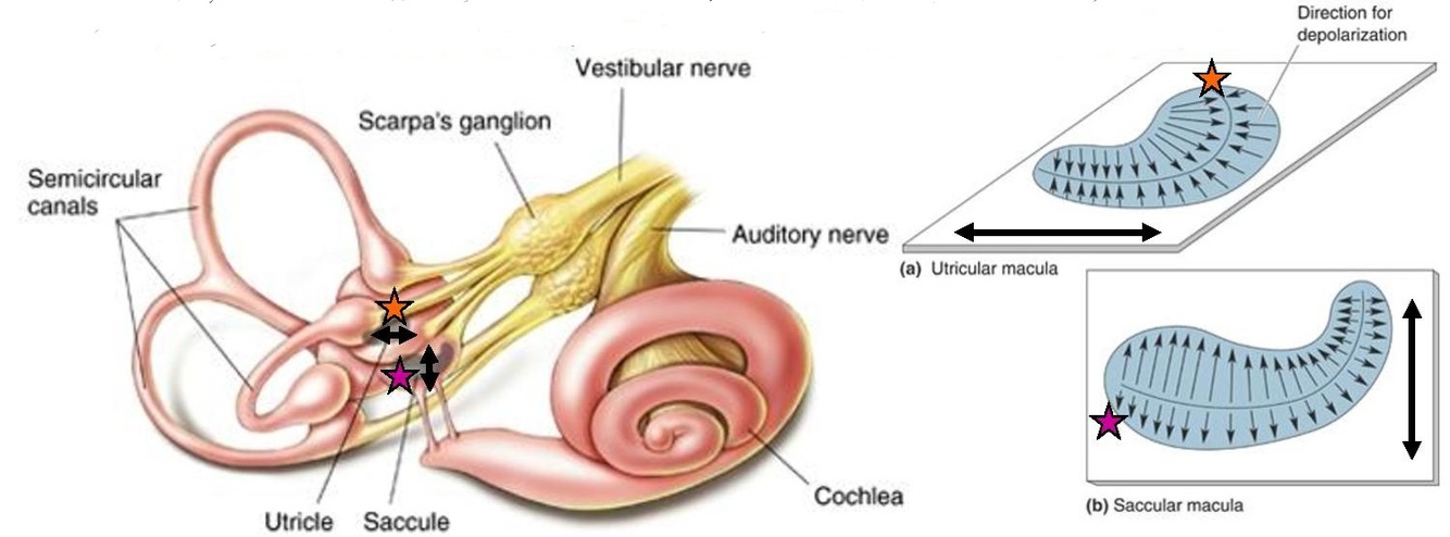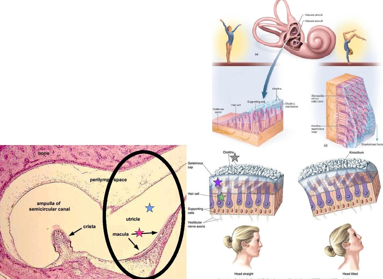 Sensory hair cells’ cilia embedded in gelatinous mass called the otolithic membrane (purple) - this is studded with “weighty” calcium carbonate otoliths (grey)