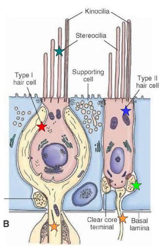 Vestibular hair cells similar to auditory hair cells (Organ of Corti) except within each hair tuft of stereocilia there is a single, longer kinocilium projecting on only one side of the cell.