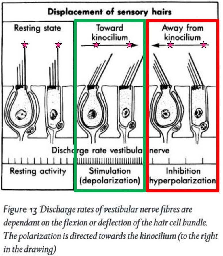 Displacing of hair tuft towards or away from the kinocilium determines whether or not the sensory hair cells release neurotransmitter that stimulates the receptive ends of bipolar primary (vestibular sensory neurons)