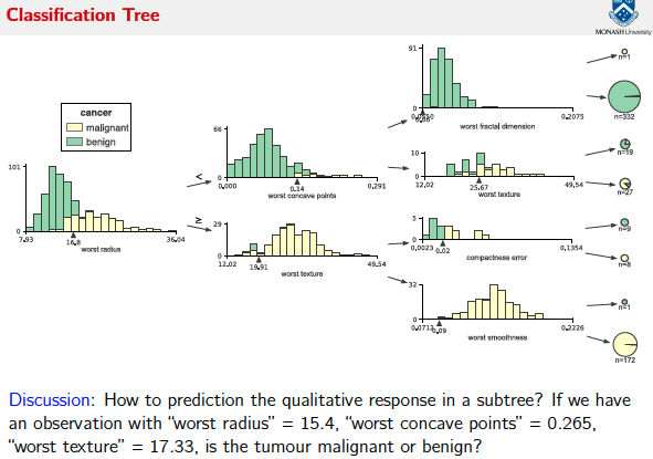 If we have an observation with “worst radius” = 15.4, “worst concave points” = 0.265, “worst texture” = 17.33, is the tumour malignant or benign?