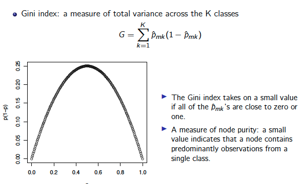 The Gini index is a measure of total variance across the K classes. It will be small if all of the classes are the same type.
