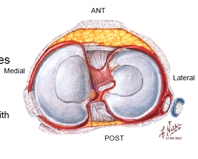 Intracapsular but extrasynovial; Allows rotation & stabilisation in A-P direction