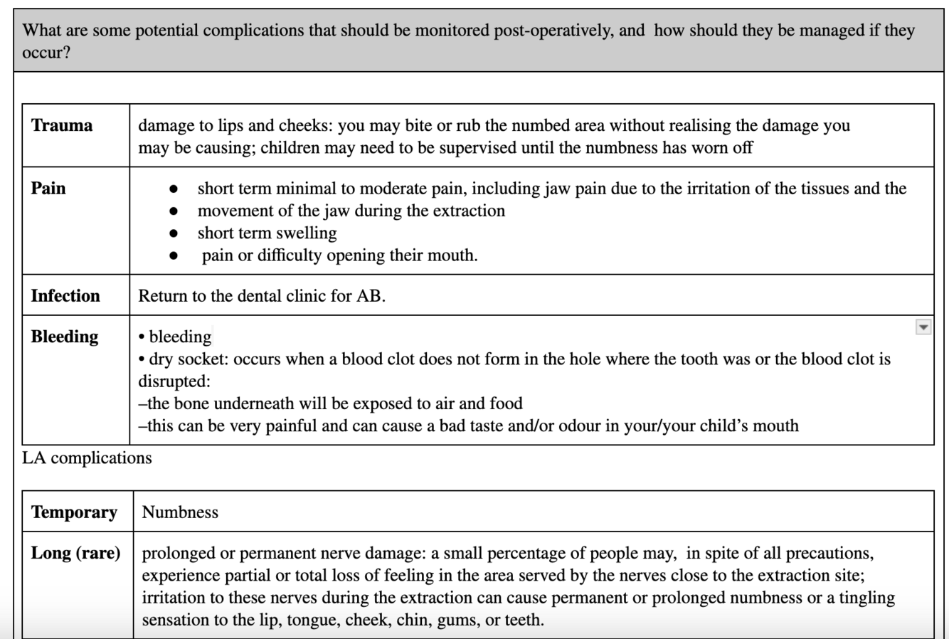 Exo post op: avoid spitting, rinsing or straw sucking for the day, no physical exercise. Rest, rinse with salt water, resume tomorrow brushing teeth without disturbing wounds, soft food diet first 2 days.