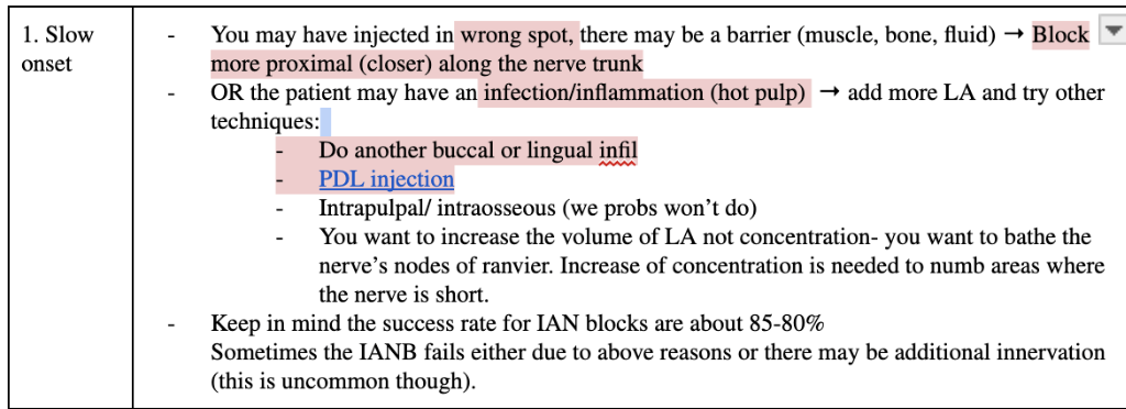 Because of the anatomy of the Pterygomandibular space, and the fact that the lingual nerve is positioned medial and anteriorly to the IAN nerve, it is more frequently nicked during IAN blocks than the IAN nerve itself. (whereas IAN nerve more likely to be damaged during surgery of lower molars (Most frequently wisdom teeth given how close their position is to the IAN in the Mandibular canal)