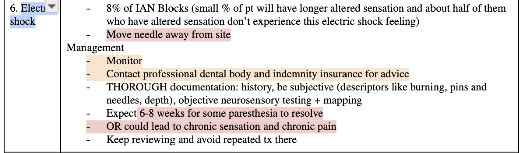 During the injection, the patient complains of a very sharp transient electric shock like pain. They don’t have this pain during the appointment, or after treatment. 3 days later they present to you, and their primary complaint is that they still can’t feel their tongue. What may have resulted in this? How would you manage this client?