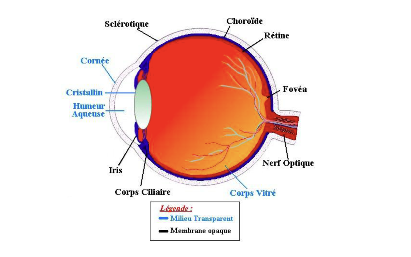 L’oeil est un organe sphérique de 25mm de diamètre , il possède un segment antérieur transparent et un segment posterieur