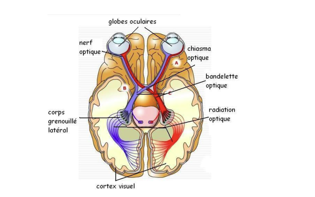 En effet, comme les fibres issues de la rétine nasale vont décusser, elles transfèrent l’information visuelle vue par l’œil homolatéral dans l’hémichamp controlatéral alors que comme celles issues de la rétine temporale ne décussent pas, elles transfèrent l’information visuelle vue par l’œil controlatéral dans l’hémichamp controlatéral.