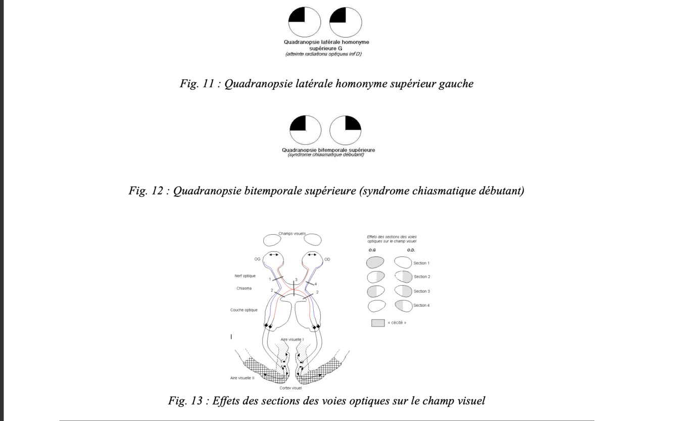 Par exemples, une atteinte des radiations optiques inférieures droites provoque une quadranopsie latérale homonyme supérieure gauche (cf. Fig. 11) alors qu’une atteinte débutante du chiasma entraîne une quadranopsie bitemporale supérieure (cf. Fig. 12).