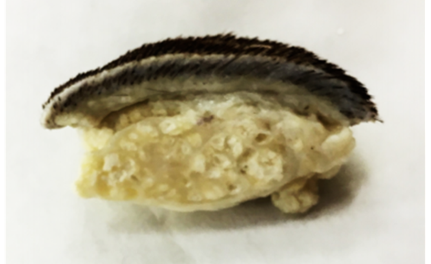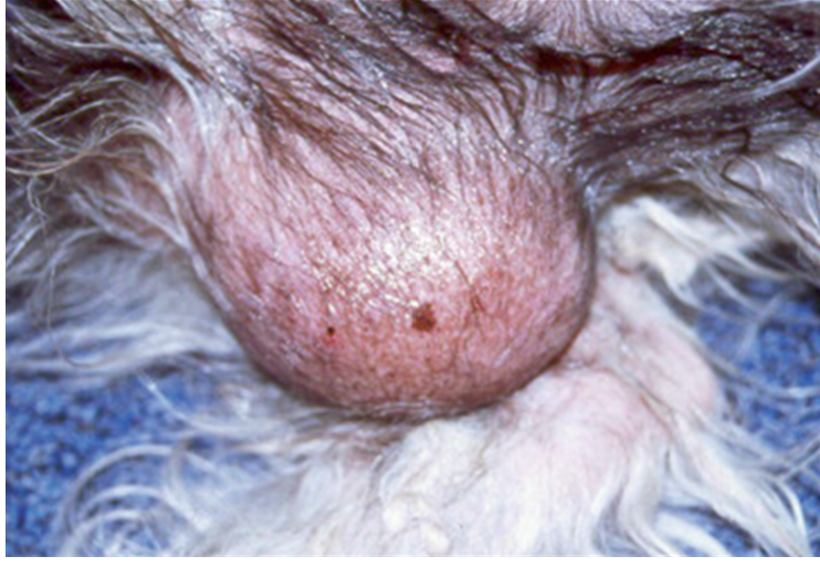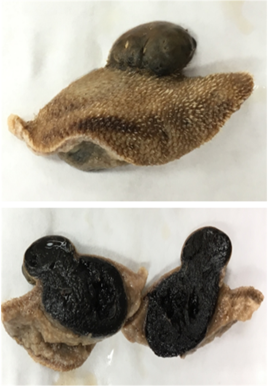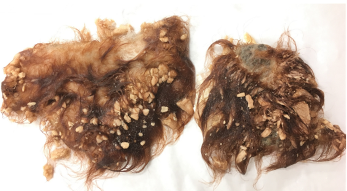Pale tan to white colored plaques, papules, or nodules that could be ulcerated (not in this case) and alopecic. On cut surface, there is a multilobulated mass that is composed of tan to white, firm, and gritty material.