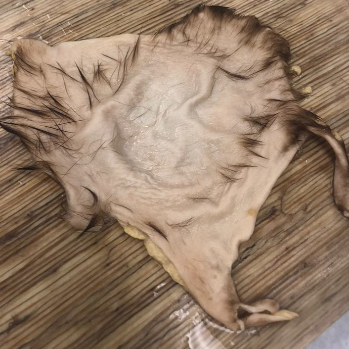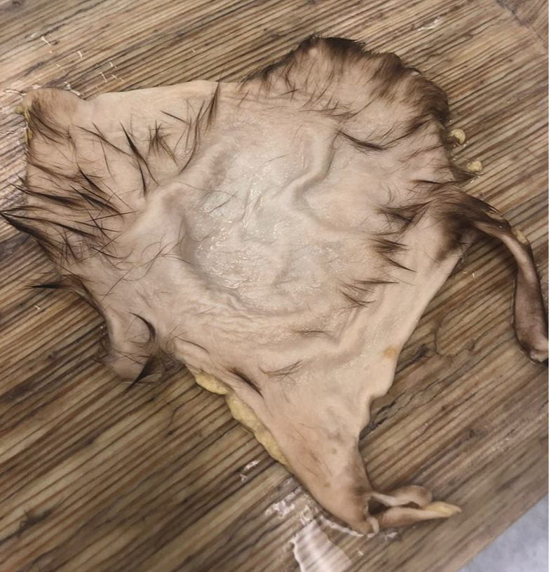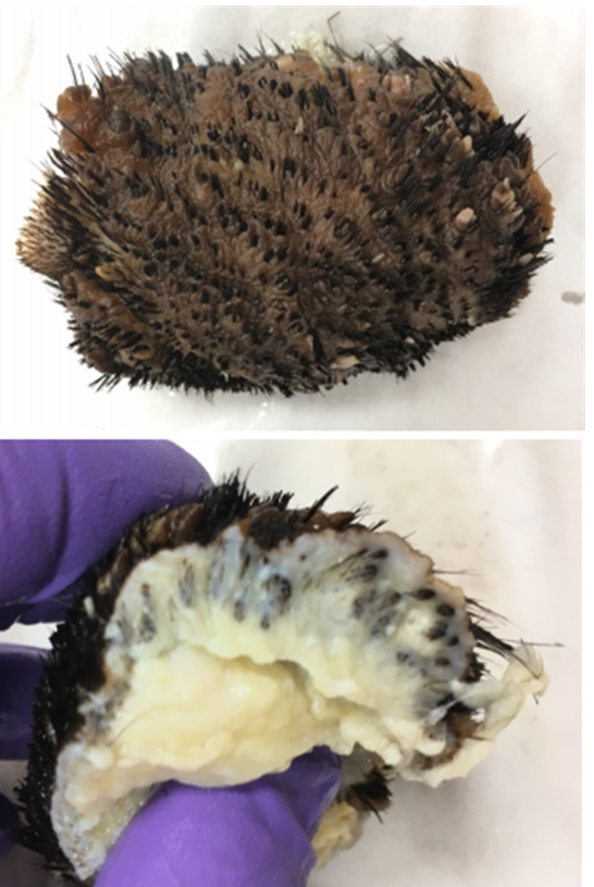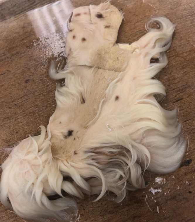 bilaterally, there are 12x12x10 areas on the ventral trunk that lack hair (alopecia), on cut surface, the skin subjectibely feels and appears thin