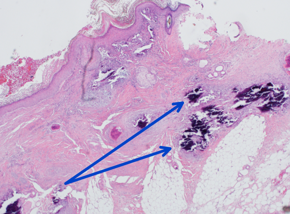 Skin: chronic, multifocal to coalescing, dermal calcificaiton