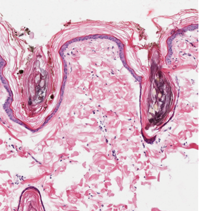 Follicular hamartomas present as plaques or nodules that have thick, brush like hairs protruding from the both the epidermal surface and into the dermis. The epidermis and dermis are usually thickened.