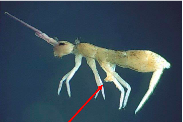 No compound eyes, no antennae, no wings, few/no trachea, entognathus, piercing-sucking mouthparts. Small and whiteish.
