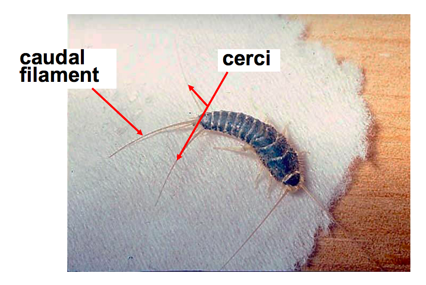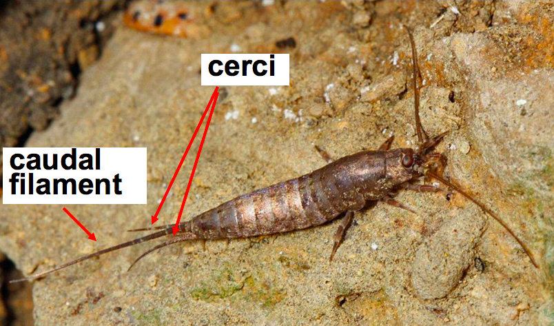1. Three tail-like appendages (2 cerci and 1 caudal filament). Cerci shorter than filament jaw Mandibles with single condyle - ancient 2. Compound eyes large 3. Body cylindrical (humpbacked) 4. Long maxillary palp