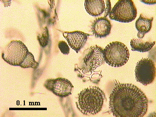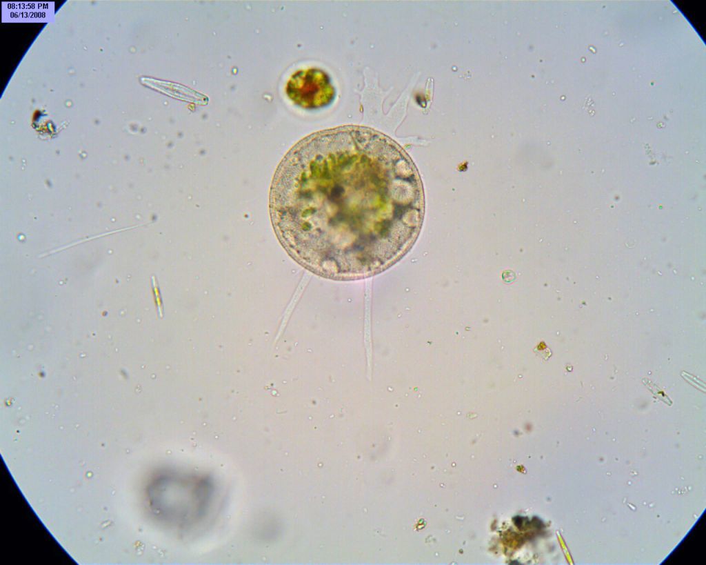 Arcella sp. Belongs to Amoeboid protists. Test is the circular halo,and pseudopodia emerge from holes in the test.