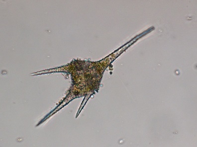 Radiolarian tests. Usually made of silica. They have axopodia, which are phagocytic pseudopodia supported by microtubules