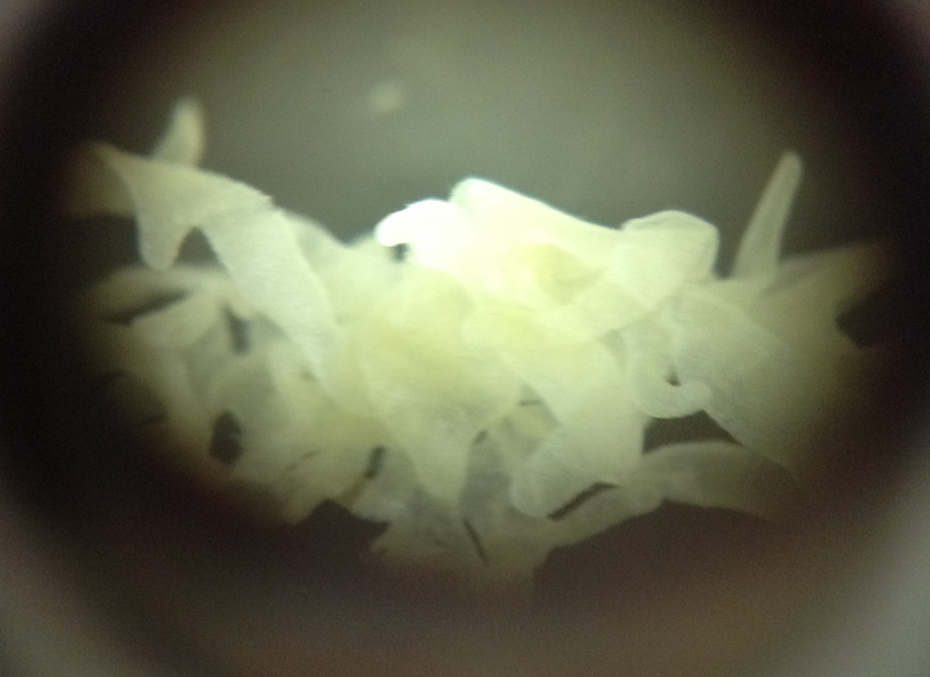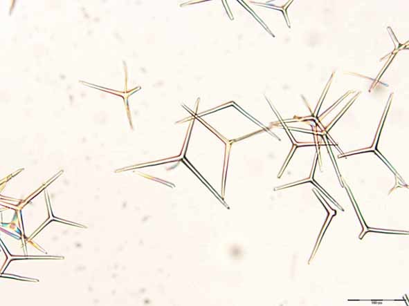 Sponge spicules. Made of calcium carbonate or silica, come from sclerocyte cells