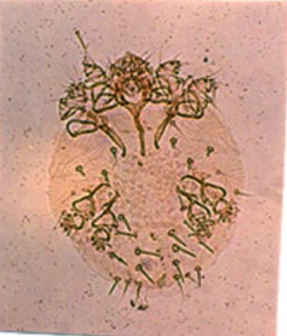 stalked pedicel and the suckers on 1st and 2nd pair of legs. long trailing hairs or setae