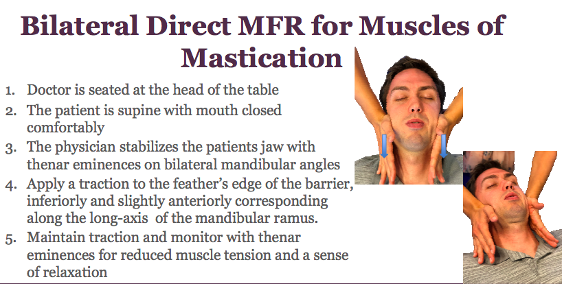 What is the correct setup and technique of bilateral direct MFR/ST for Muscle of Mastification?